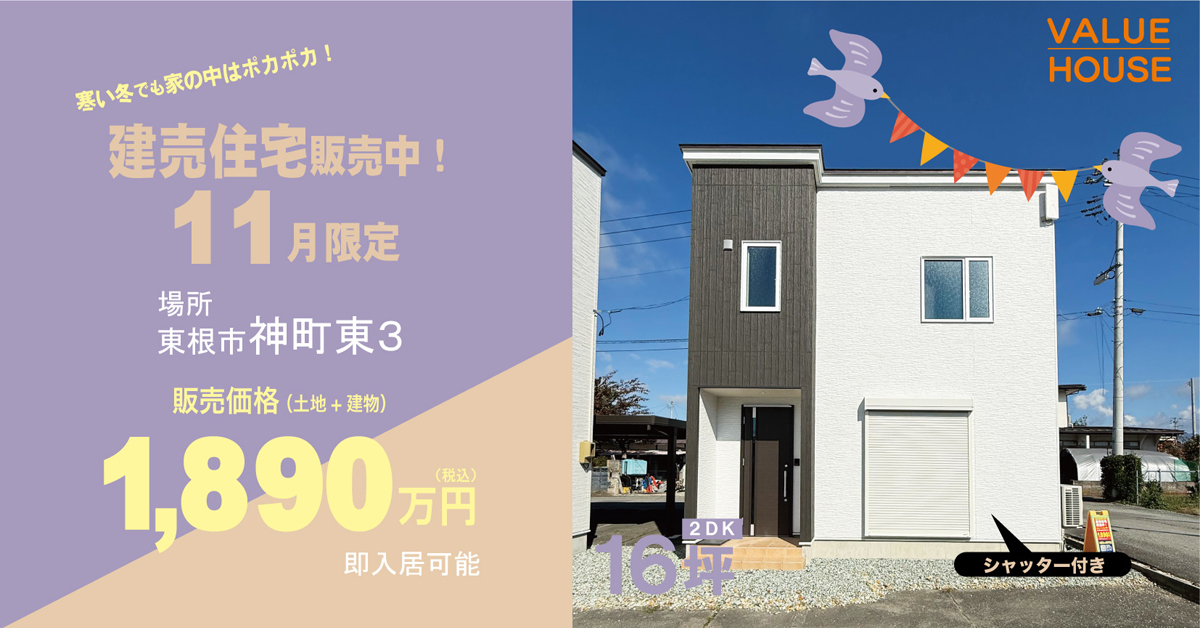 <事前予約制>11/1(土)~30(日)まで【一戸建てモデルハウス:販売価格1,890万円(税込)/即入居可】1人様~2人様用にちょうど良いin東根市