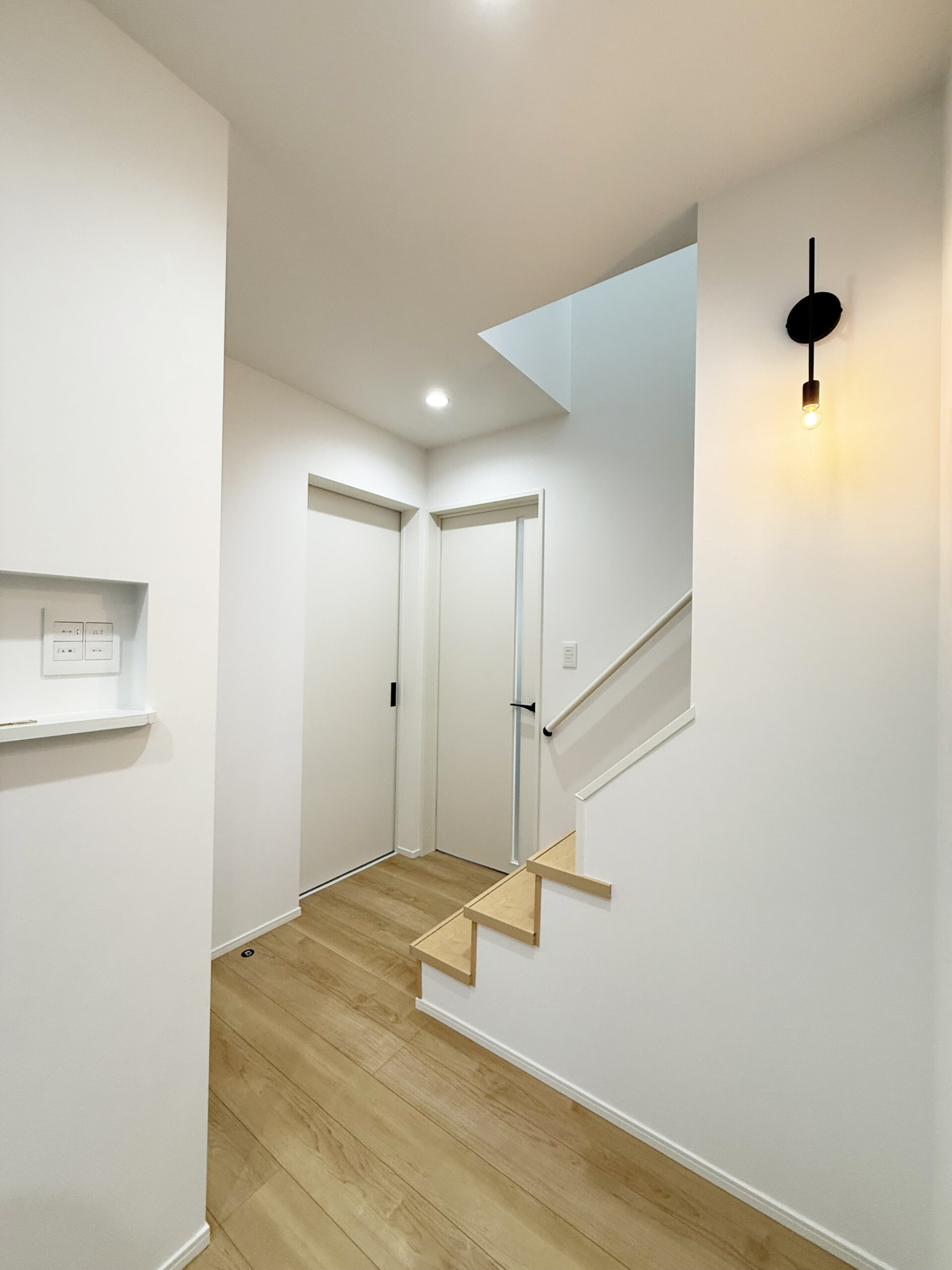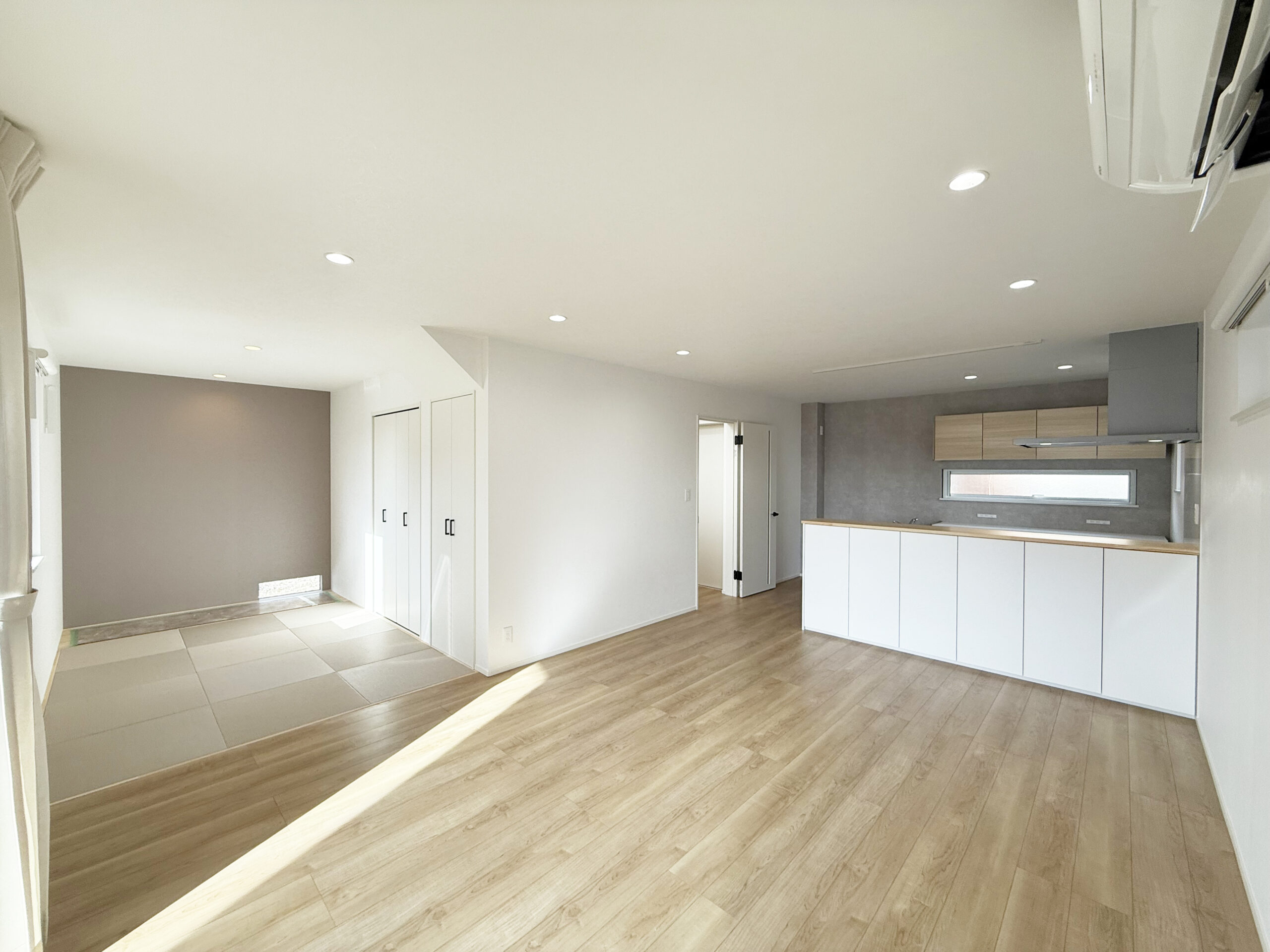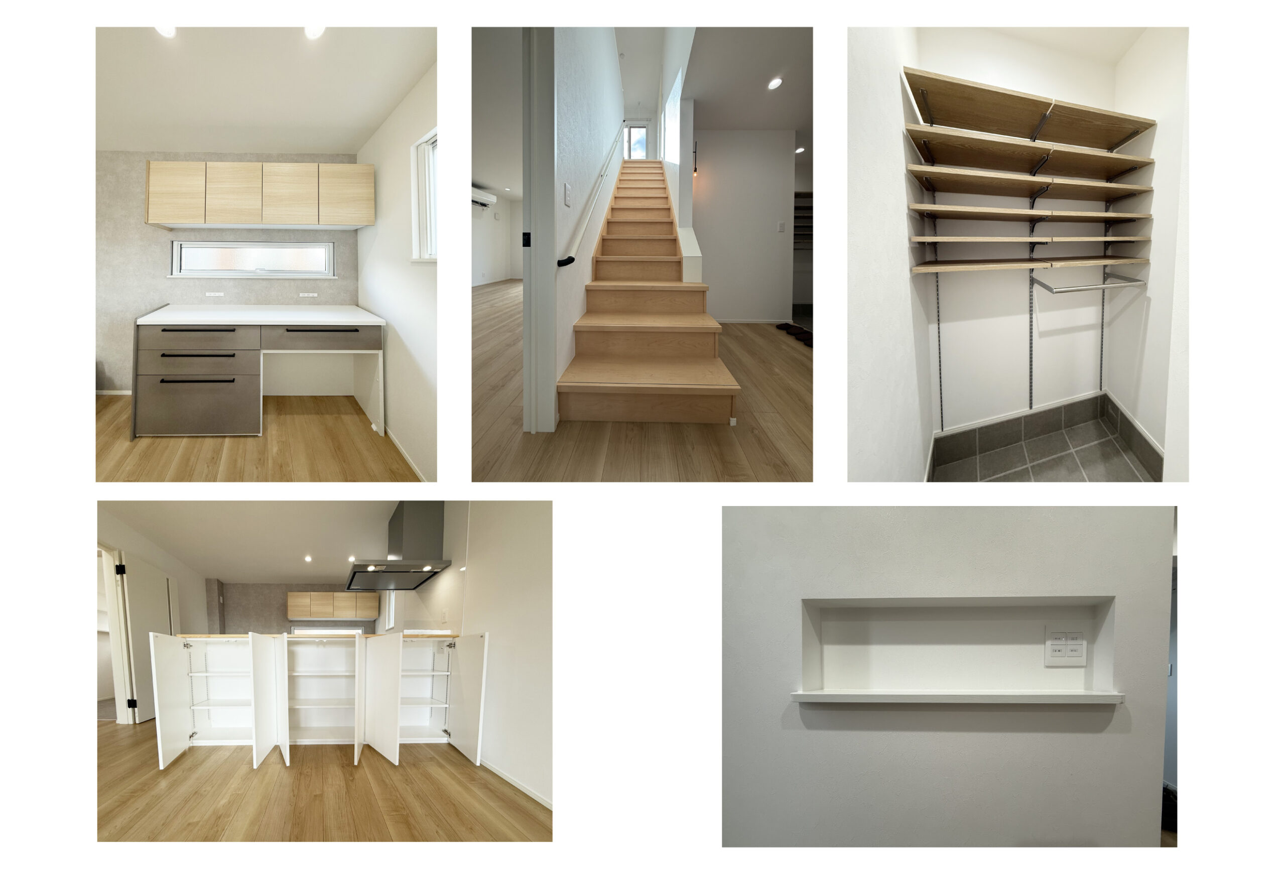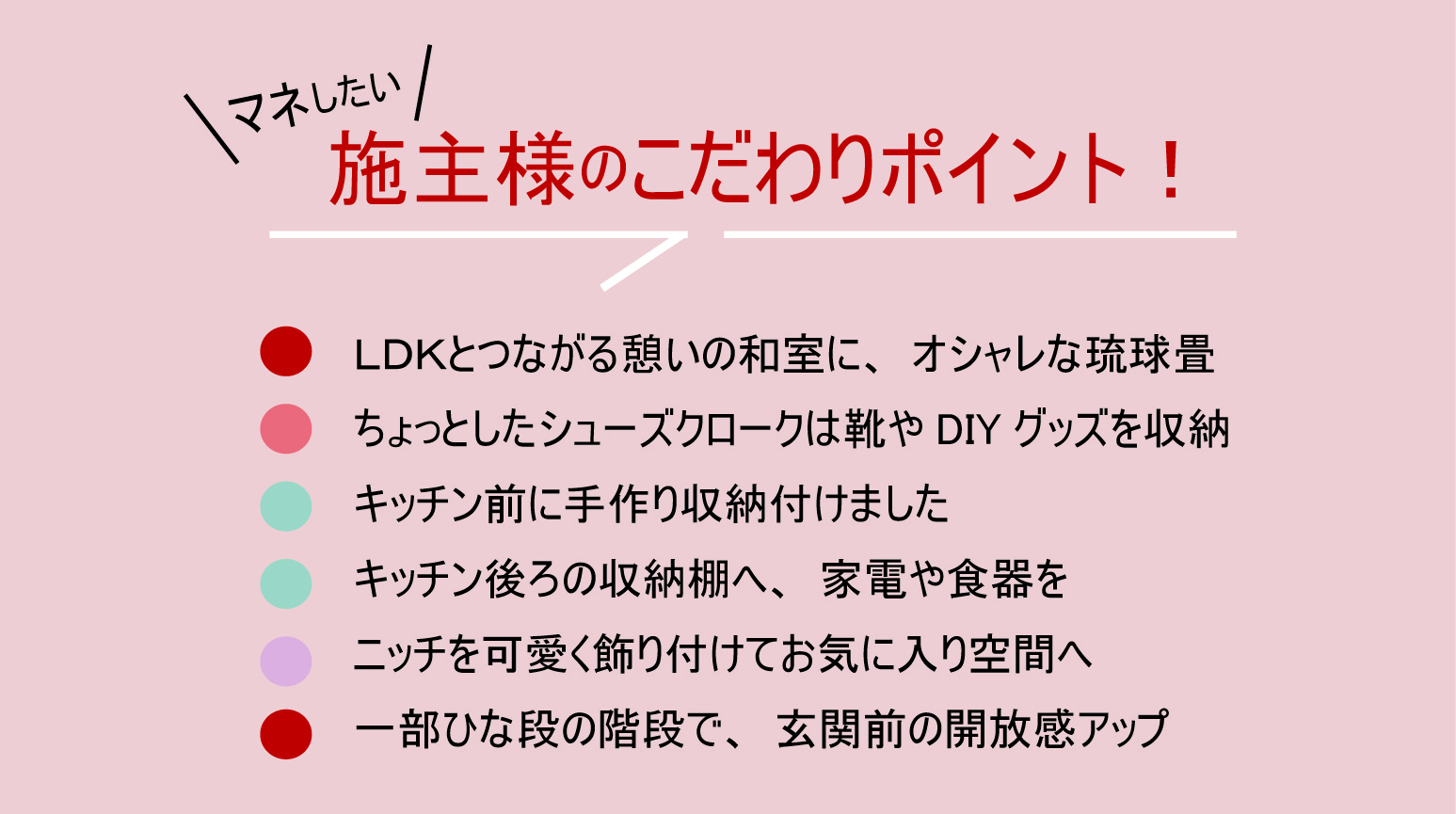 LDKとつながる琉球畳の和室、プチシューズクローク、キッチン前と後ろの収納棚、 おしゃれなニッチとスイッチ、さらに一部ひな壇階段など、見どころも盛りだくさん。