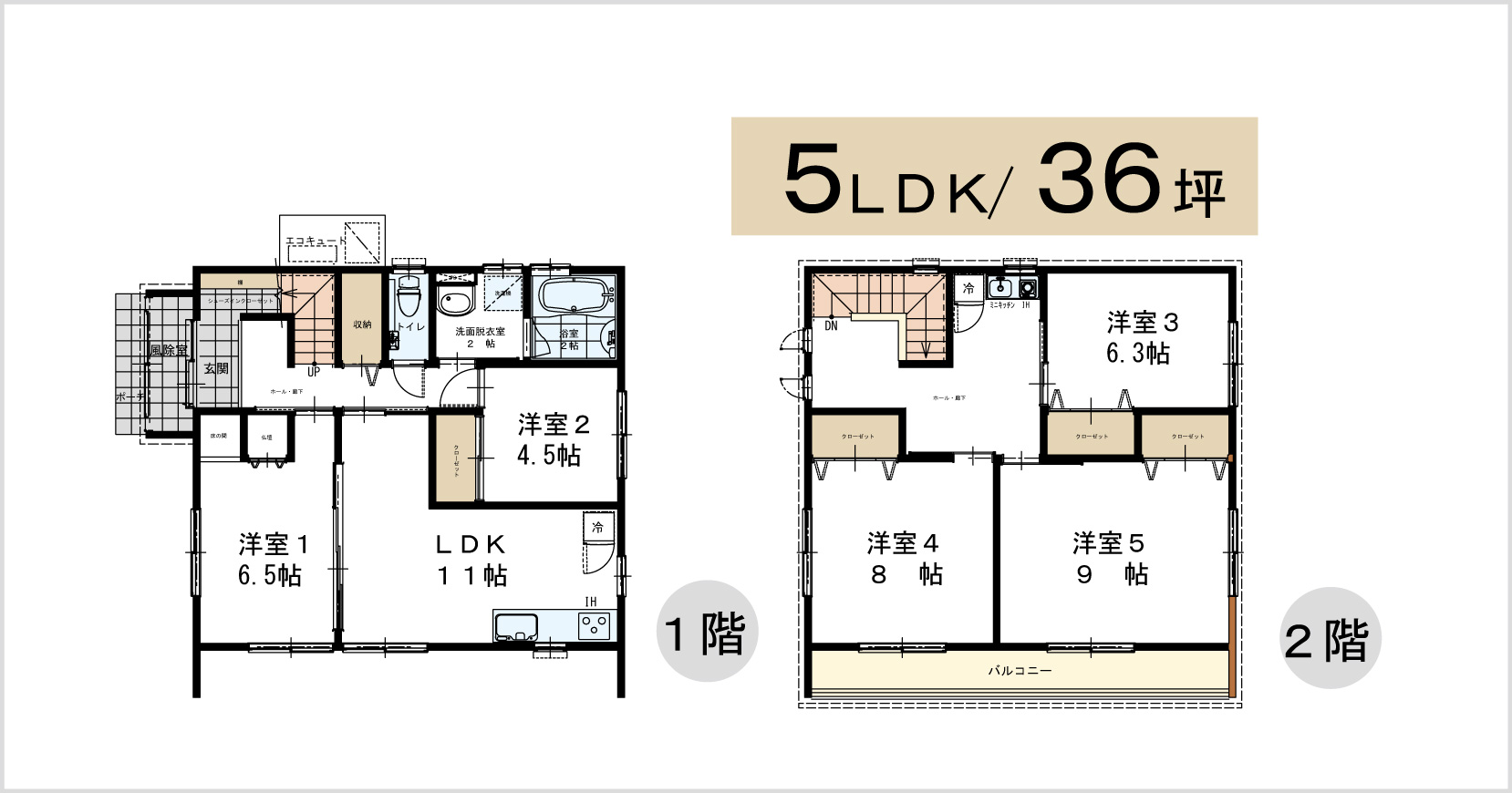2階は3部屋。9帖の主寝室、6.3帖・8帖の洋室。各部屋には収納スペースを確保。