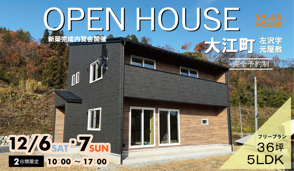 <事前予約制>【12/6(土),7(日)2日間限定】OPENHOUSE 家族5人の時間を大切にする暮らしやすいゆとり空間。コスパの良い36坪フリープランの家in大江町