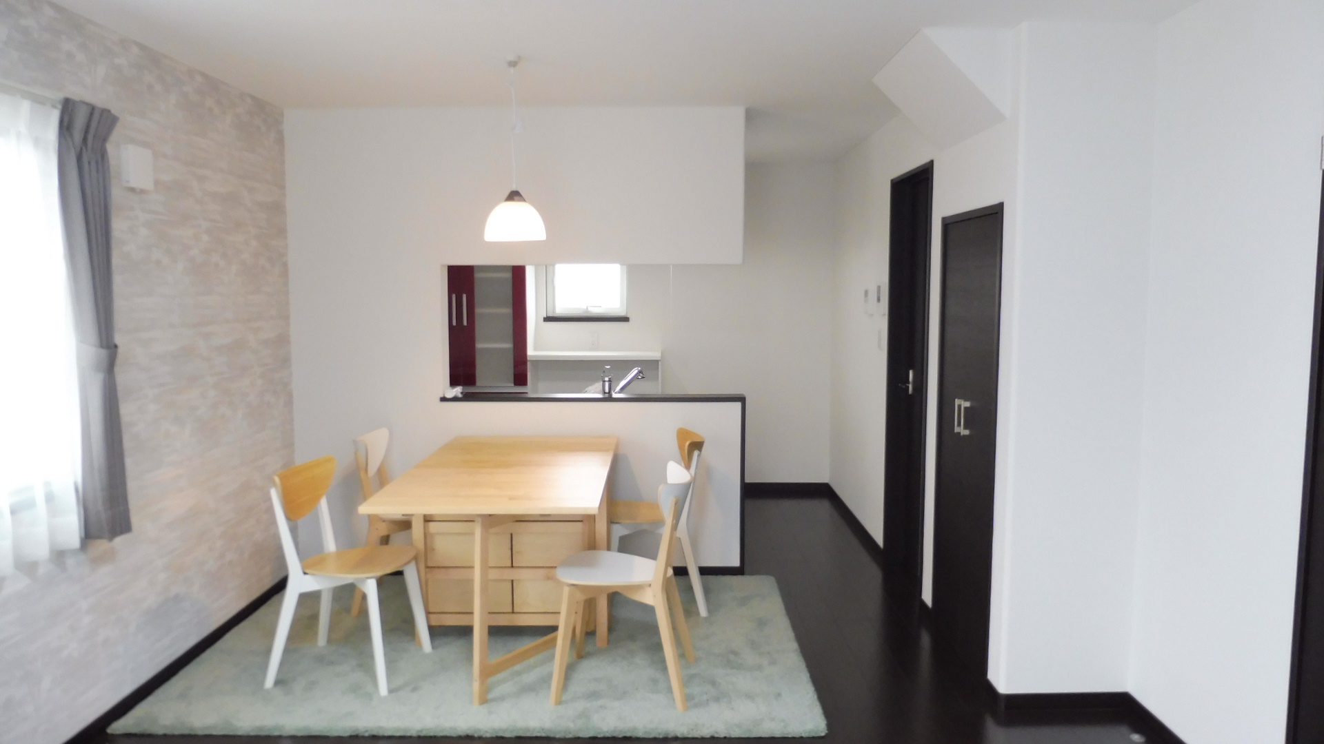 規格住宅だけど、オリジナリティが欲しい。そこで奥様が大好きなワインレッドで、キッチン周りや主寝室にアクセントクロスを入れました。 LDKも1面のクロスを変えただけで、一段とオシャレな空間になりました。